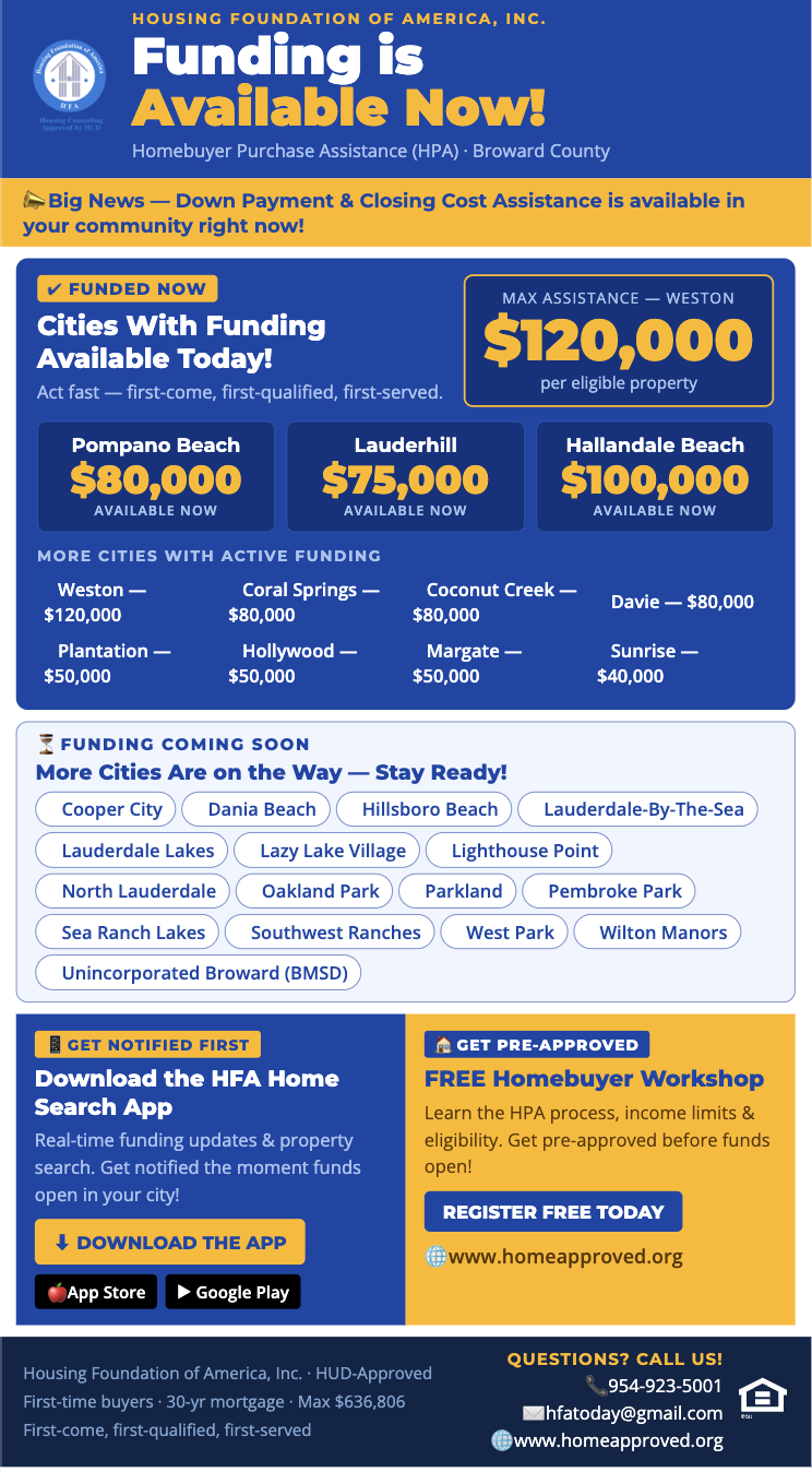 Palm Beach County's Department of Housing and Economic Development has announced the Homebuyer Match Pilot Program — This program is designed to meet working families where they are and help bridge the financial gap that has kept so many residents from crossing the threshold into homeownership.