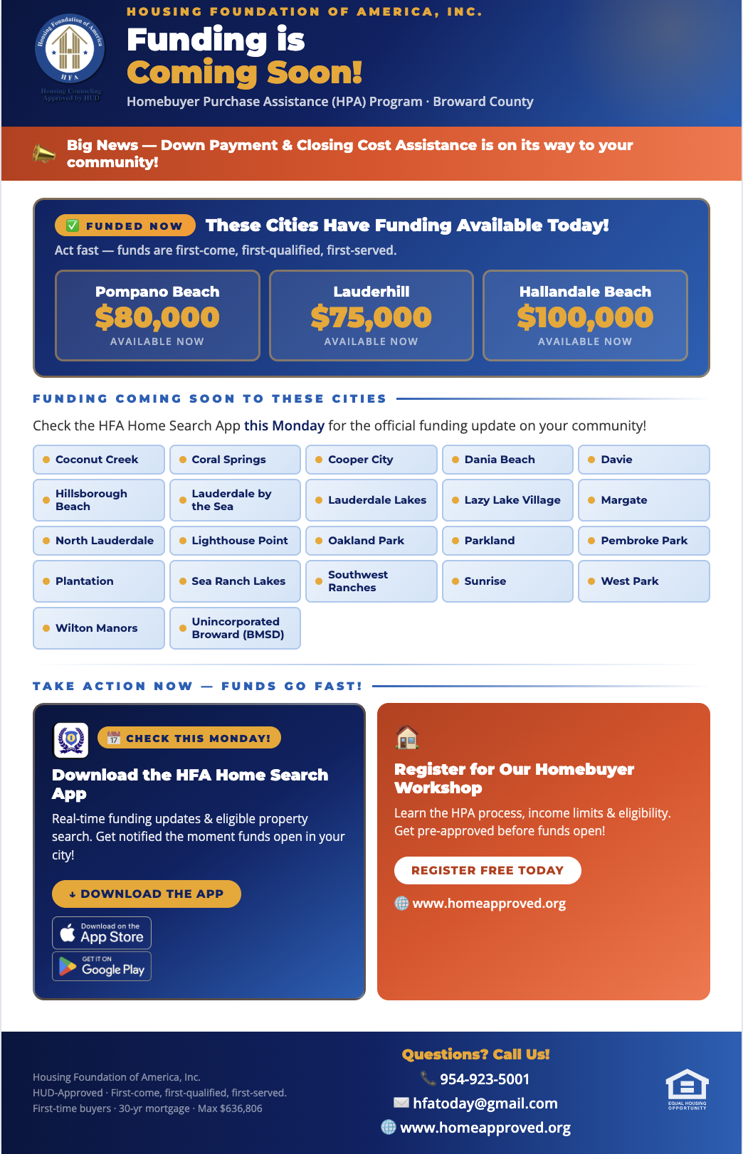 Broward County's Homebuyer Purchase Assistance (HPA) Program is preparing to release down payment and closing cost assistance across municipalities throughout the county. That means real dollars — real help — could be coming to your community very soon.